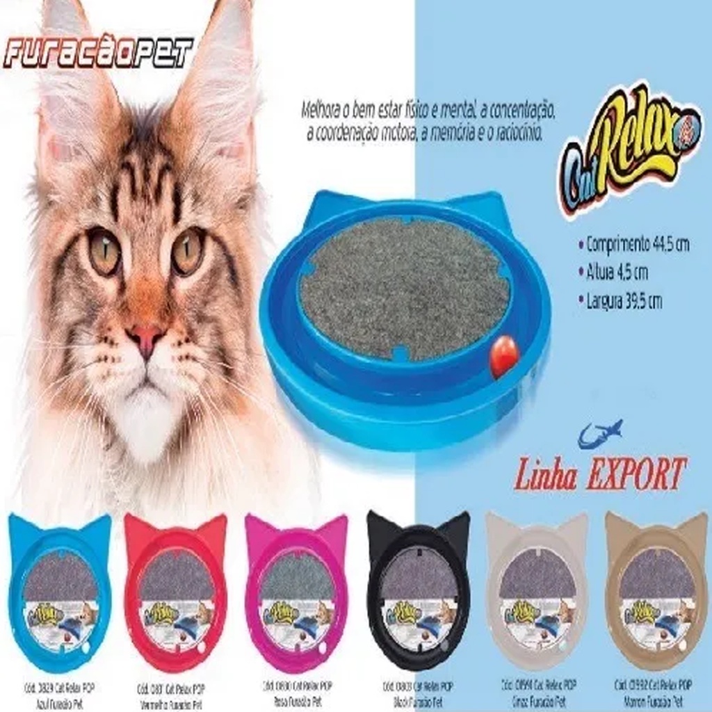 O Super Cat Relax Furacão Pet Pop, com formato da cara do gato, proporciona tudo aquilo que seu pet precisa para ter um dia tranquilo. O feltro no centro é perfeito para arranhar e condicionar as unhas, deixando-o bem longe dos móveis da casa. A bolinha de plástico maciça, circula na extensão de uma canaleta, aguçando o instinto natural de caça do seu gato. E quando ficar cansado é só se esparramar sobre o Super Cat Relax Pop e relaxar! Ajuda a melhorar o bem estar físico e mental promovendo a concentração e coordenação motora, além de ampliar a memória e o raciocínio do seu bichano. Aquele presente top que seu pet vai amar!