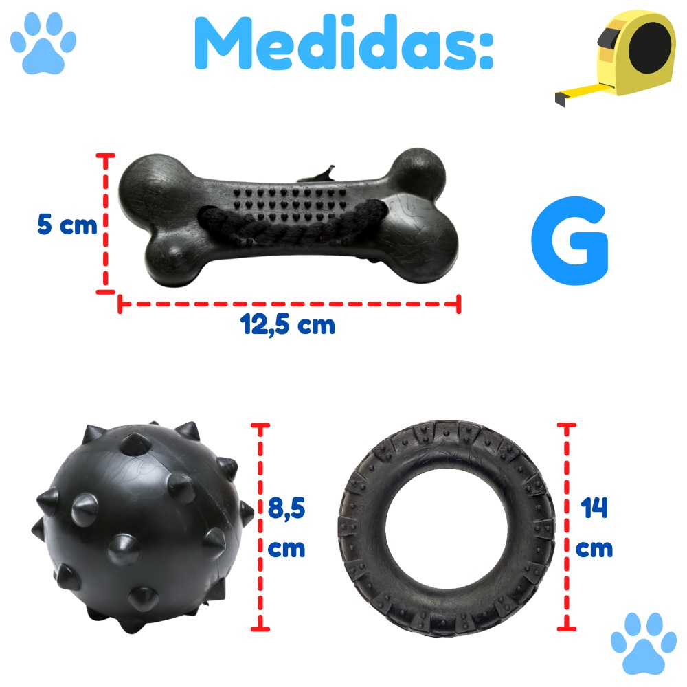 Itens Inclusos: 1 Brinquedo Pneu de Borracha Resistente para Cães G + 1 Ossinho Massageador Black G + 1 Bola Cravo Maciça 85 mm